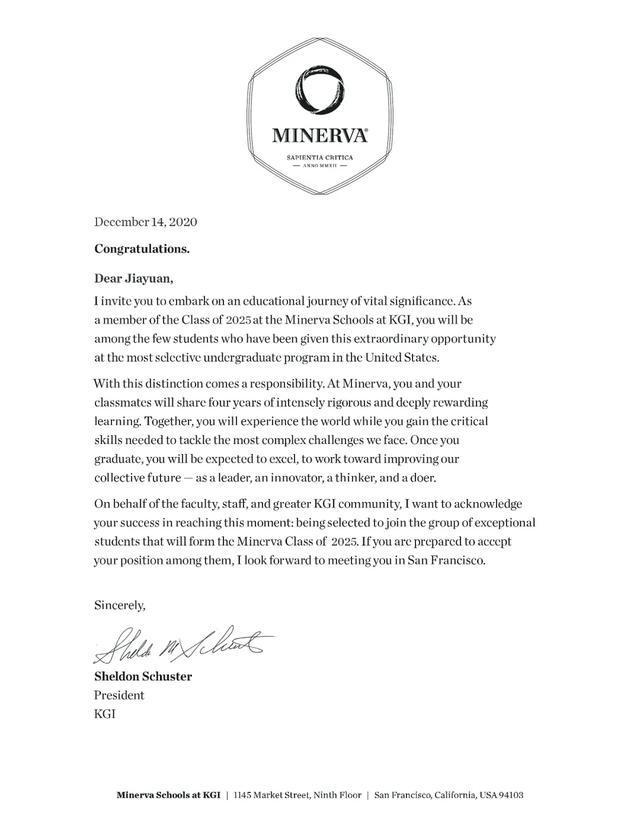 9月,她正式成为美国密涅瓦大学的大一新生。去年秋冬申请季,她陆续收到了QS世界大学排名前50的名校的录取通知,包括美国伊利诺伊大学厄巴纳-香槟分校、澳大利亚新南威尔士大学等。但看到密涅瓦大学的邀约后,她毫不犹豫地点击了“绑定入学”。